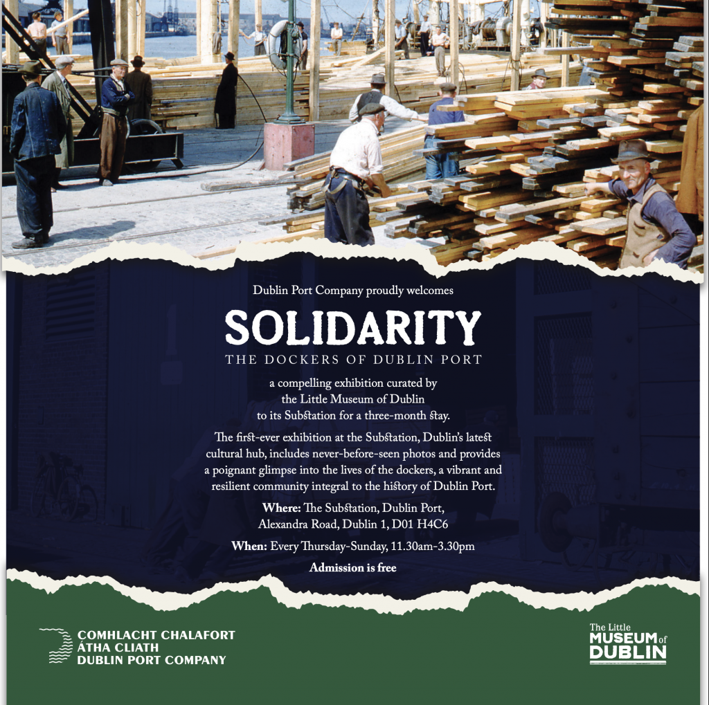 The Dockers of Dublin Port, a new exhibition curated by The Little Museum of Dublin, to be presented in the newly refurbished Substation building on Alexandra Road. Solidarity charts the story of one of Ireland’s most fascinating industrial subcultures: the dockers. Their story is one of hardship but also one of humour and resilience.
