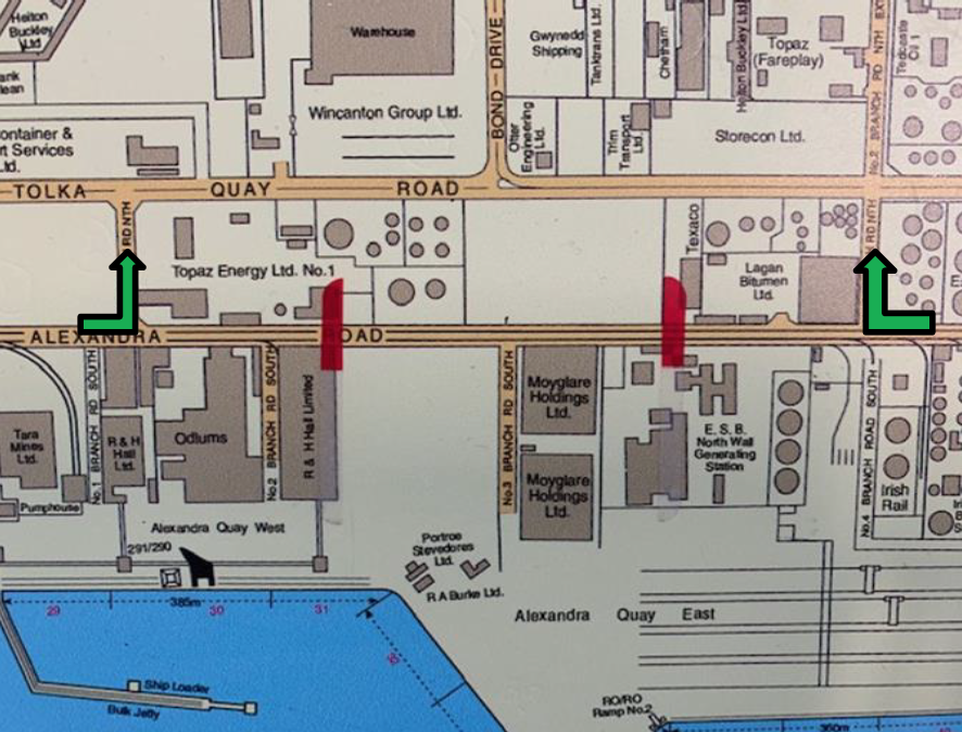 Traffic permitted to enter No.2 Branch Road South includes DPC personnel, R&H Hall staff and transporters, Dublin Stevedores Ltd personnel, Doyle Shipping Group personnel, Bord Na Mona HGV’s, Cement boat HGV tankers, Cruise related business, and current ‘No.3 Branch Road South’ access control permit holders.